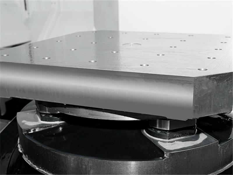 工作臺板與底座間采用四個大定位銷定位,同時兼具夾緊功能,可保證托盤剛性夾緊和精確定位,托盤的重復定位精度高。工作臺旋轉采用高精度牙盤定位,分度精度高、承載大。
